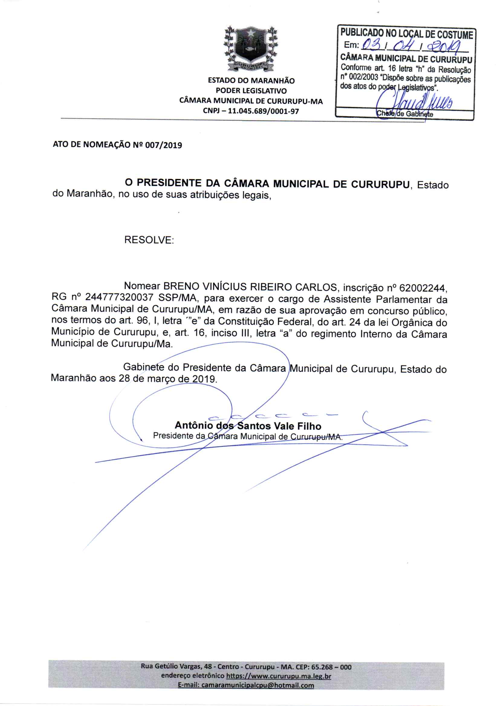 CÂMARA MUNICIPAL DE CURURUPU