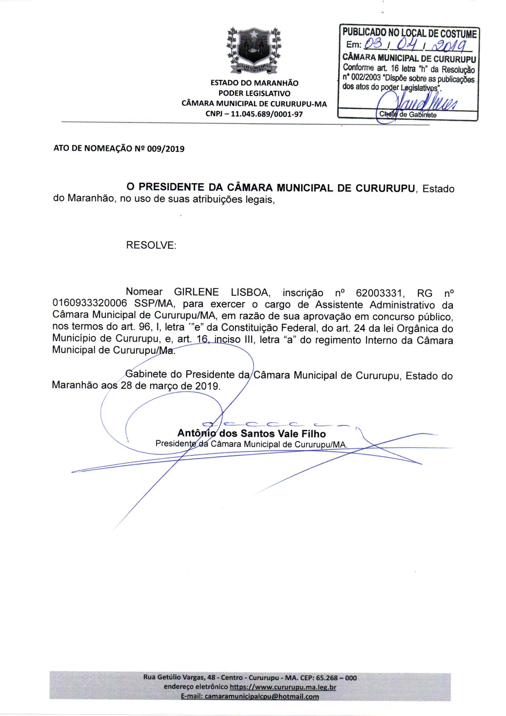 CÂMARA MUNICIPAL DE CURURUPU