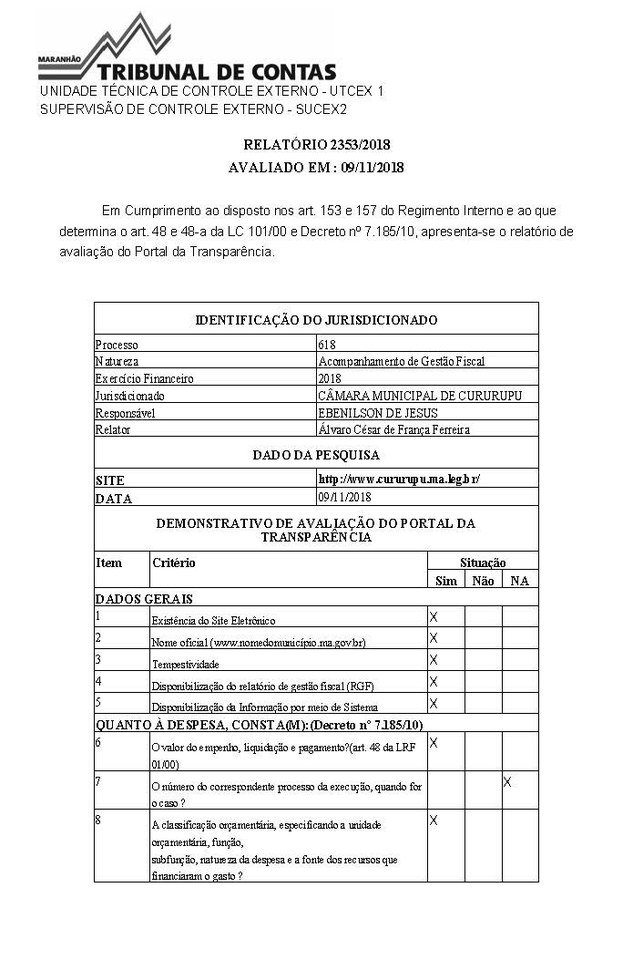 Em Cumprimento ao disposto nos art. 153 e 157 do Regimento Interno e ao que determina o art. 48 e 48-a da LC 101/00 e Decreto nº 7.185/10, apresenta-se o relatório de avaliação do Portal da Transparência.