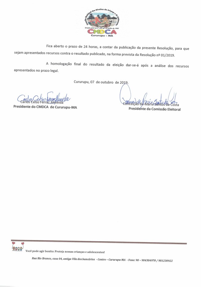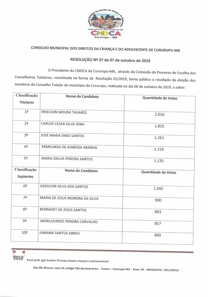 Resultado da Eleição para Conselheiros Tutelares de Cururupu