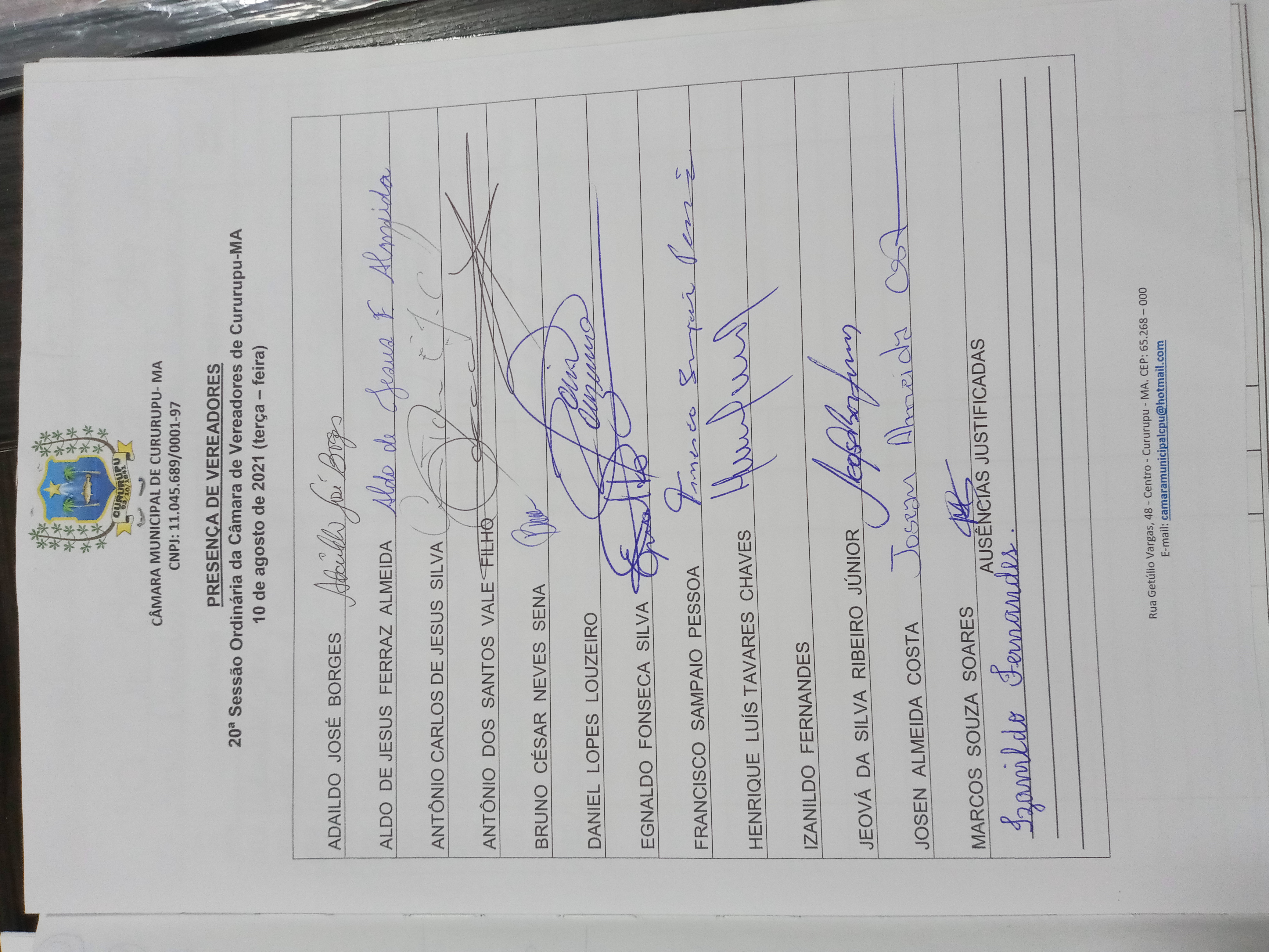 20ª SESSÃO ORDINÁRIA DIA 10 DE AGOSTO DE 2021