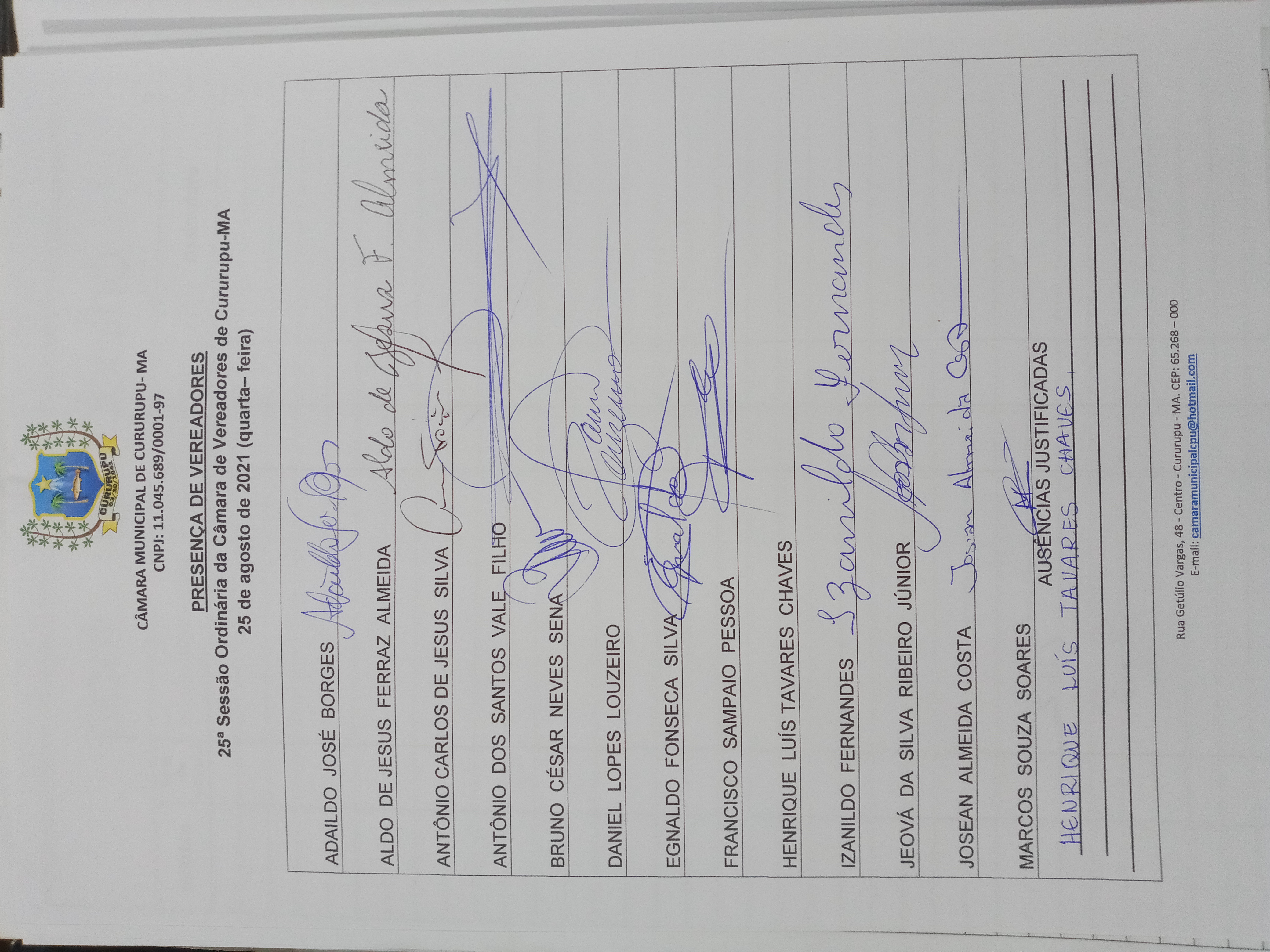 25ª SESSÃO ORDINÁRIA DIA 25 DE AGOSTO DE 2021