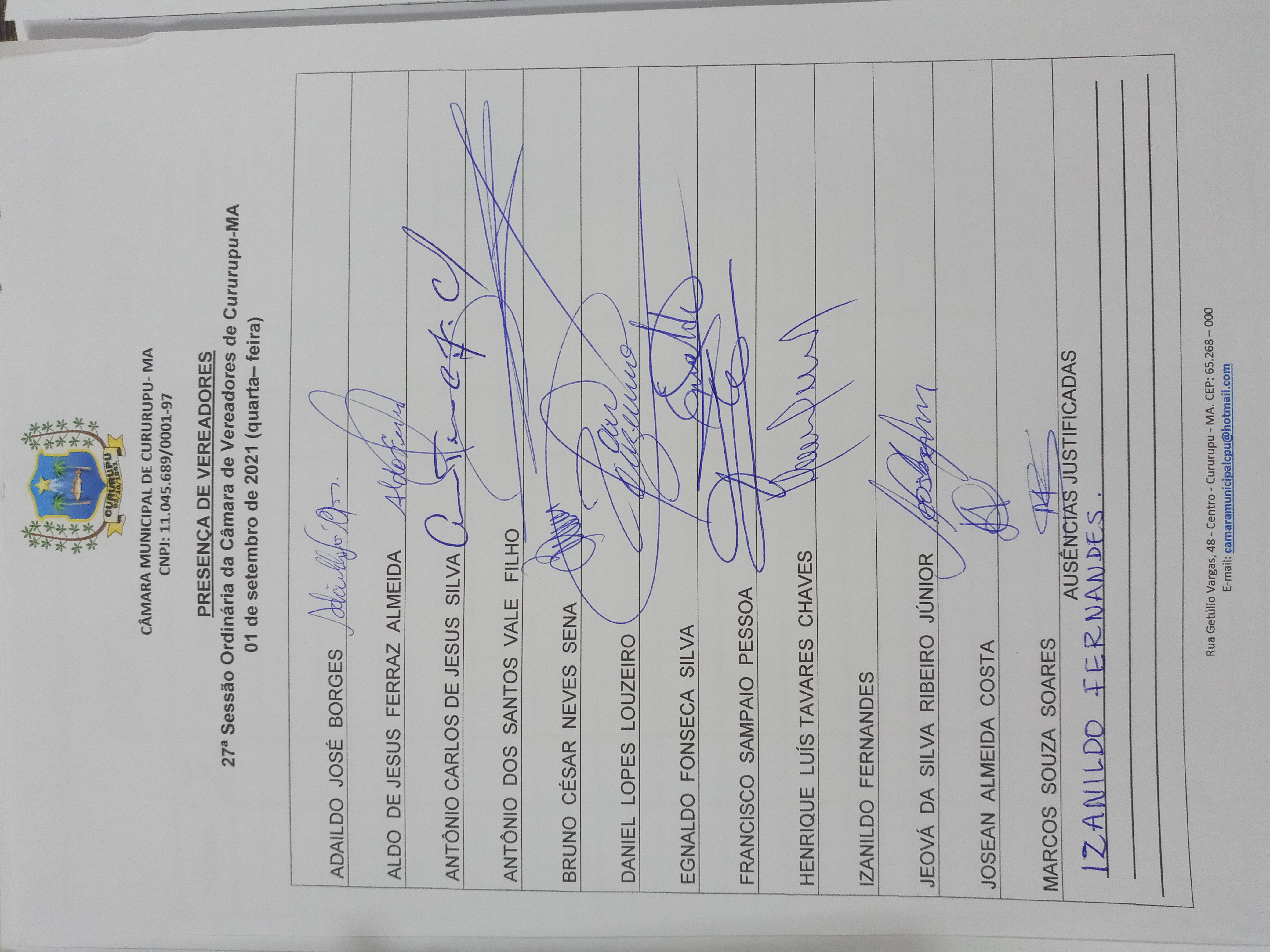 27ª SESSÃO ORDINÁRIA DIA 01 DE SETEMBRO DE 2021