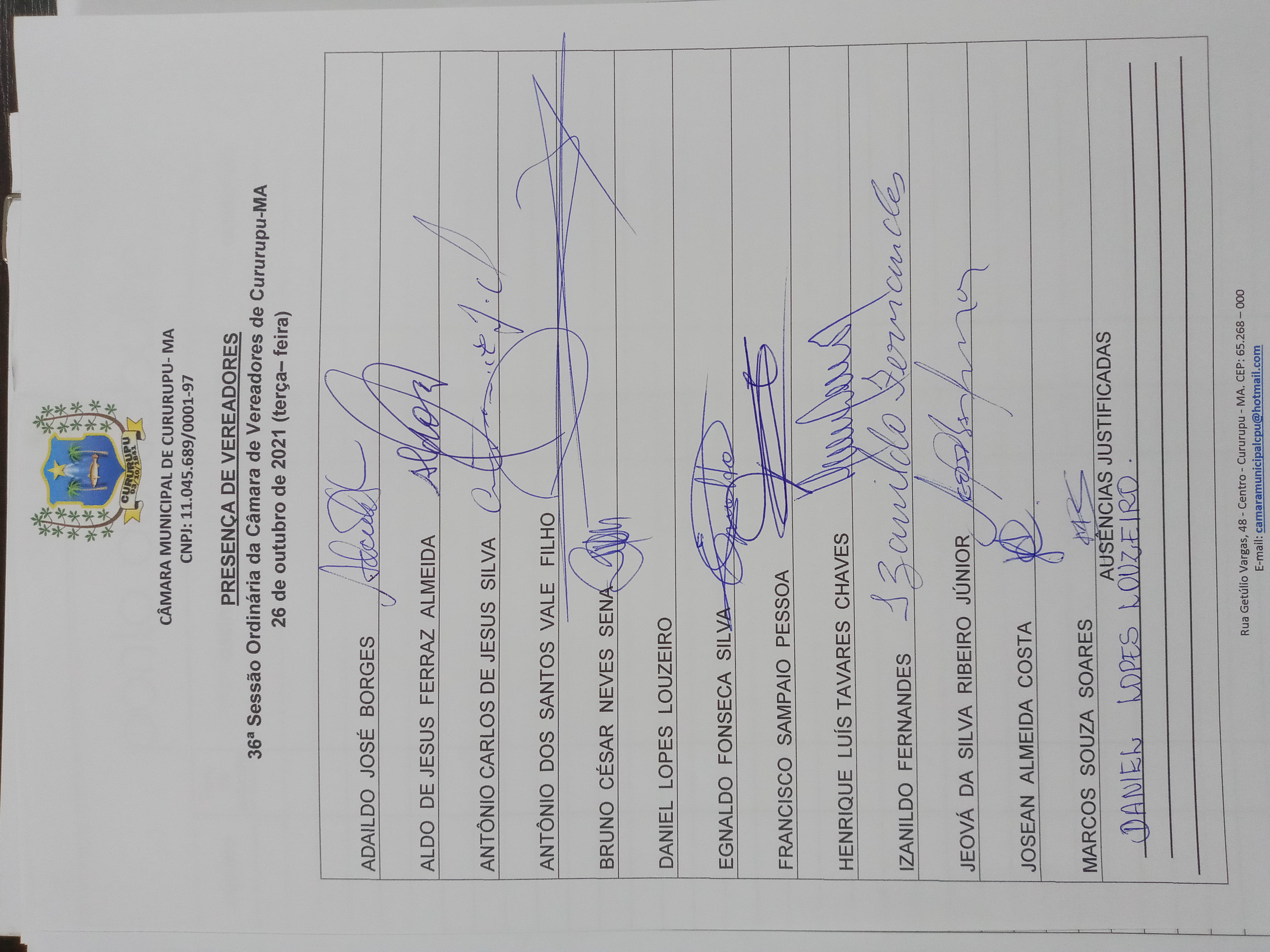 36ª SESSÃO ORDINÁRIA DIA 26 DE OUTUBRO DE 2021