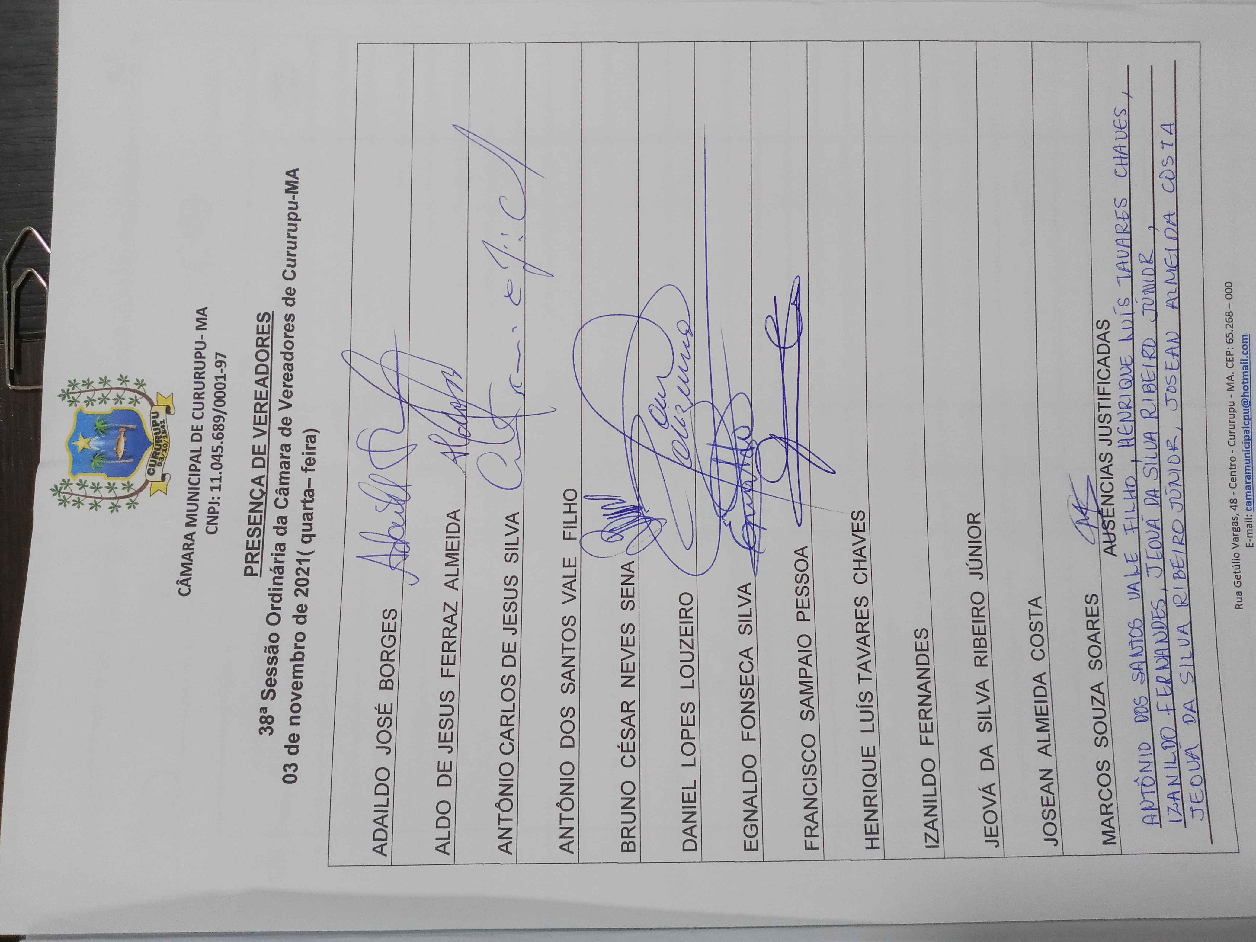 38ª SESSÃO ORDINÁRIA DIA 03 DE NOVEMBRO DE 2021
