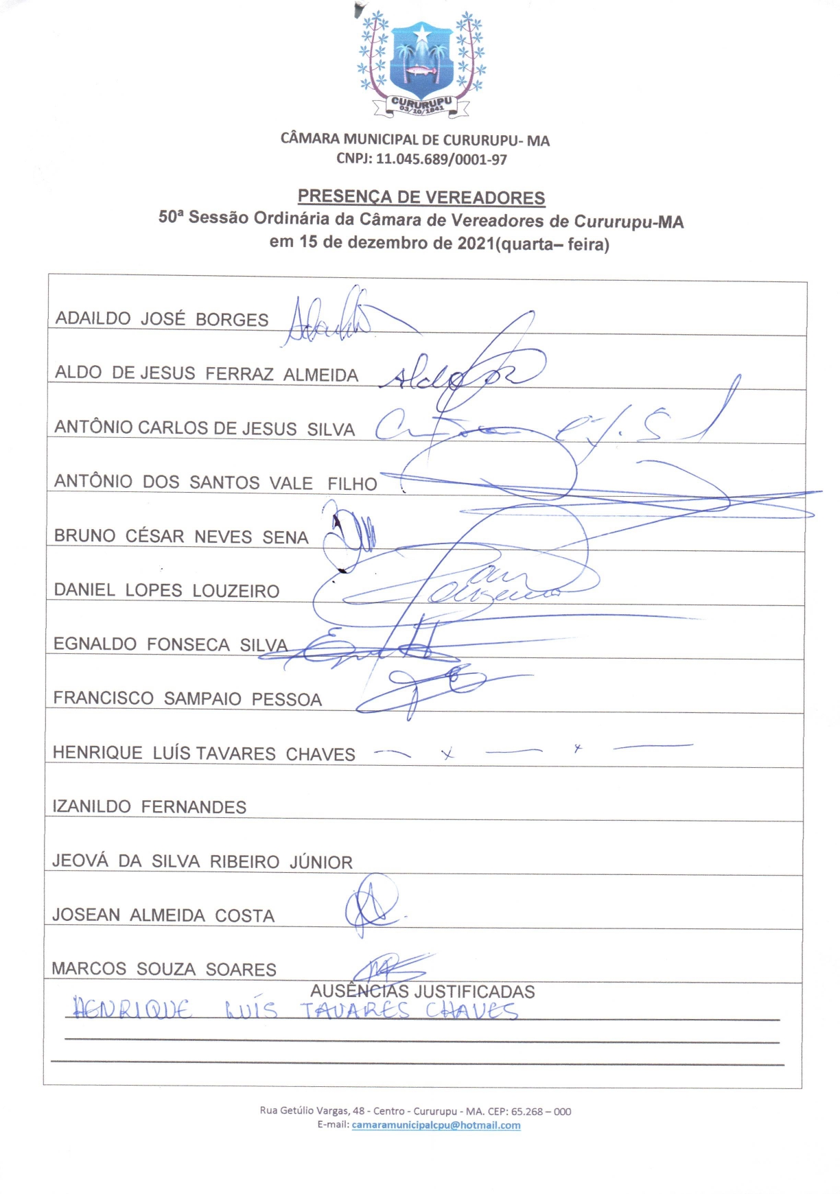 50ª SESSÃO ORDINÁRIA DIA 15 DE DEZEMBRO DE 2021